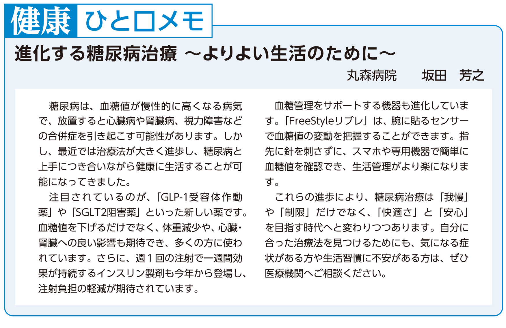 2014年に国内での販売が開始された新しい薬、「SGLT2阻害(そがい)薬」は、体重が増えない糖尿病治療薬という点で画期的と言えます。腎臓で血液を濾過して尿が作られる時、血液中のブドウ糖は一度尿に出ますが、腎臓はそのブドウ糖を尿から再吸収して血液に戻します。SGLT2阻害薬は、この再吸収の働きを邪魔することで、尿にブドウ糖が排出されるように促し、結果的に血糖値が下がります。1日70g程度のブドウ糖が尿に排出されると言われており、体重も3㎏くらい減るようです。糖尿病で障害が起きやすい腎臓を保護する効果もあると考えられています。こう書くといいことずくめのようですが、副作用もあります。薬の効果で尿量が増え、頻尿や脱水症状、膀胱炎などの尿路感染を生じる事もあり、高齢の患者さんなどに使用する場合には注意が必要です。ブドウ糖が排泄されるといっても効果は限定的ですので、他の薬剤との併用や、食事制限も重要です。お薬の選択や変更に関しては、患者さんの病状による「向き不向き」もありますので、かかりつけの主治医にご相談ください。