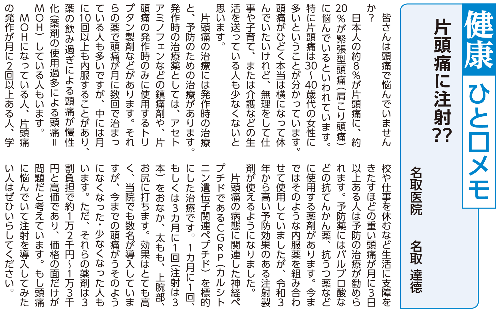 片頭痛の治療には「頭痛があるときの治療」と「予防するための治療」があります。月に10回以上頭痛薬を飲む人は予防的治療が必要です。重い頭痛があって市販の鎮痛剤を頻繁に服用している方はぜひ医師に相談してみてください。
